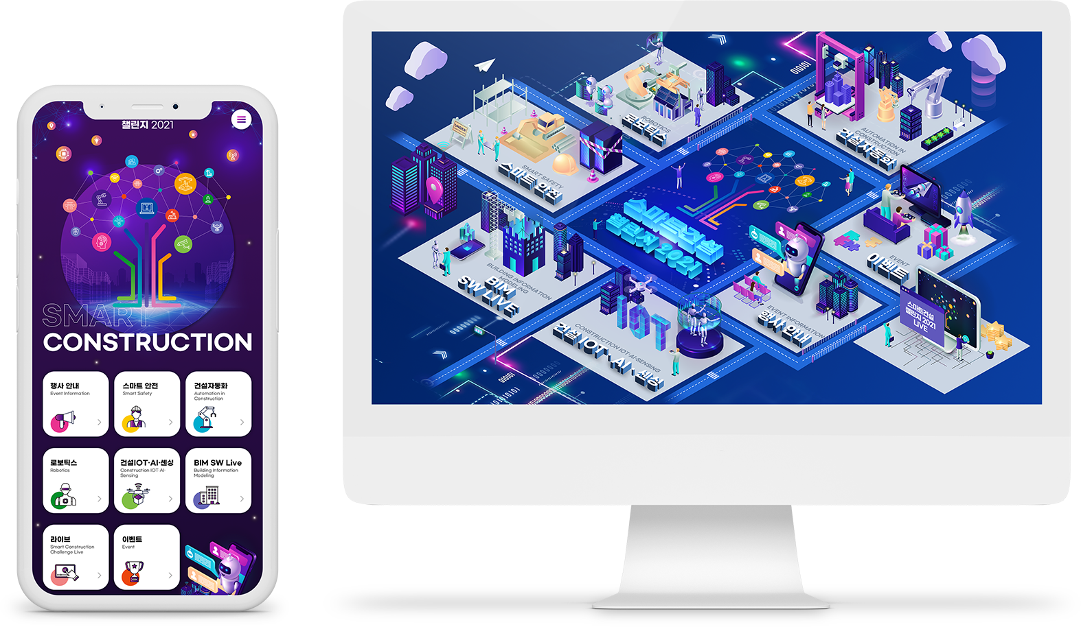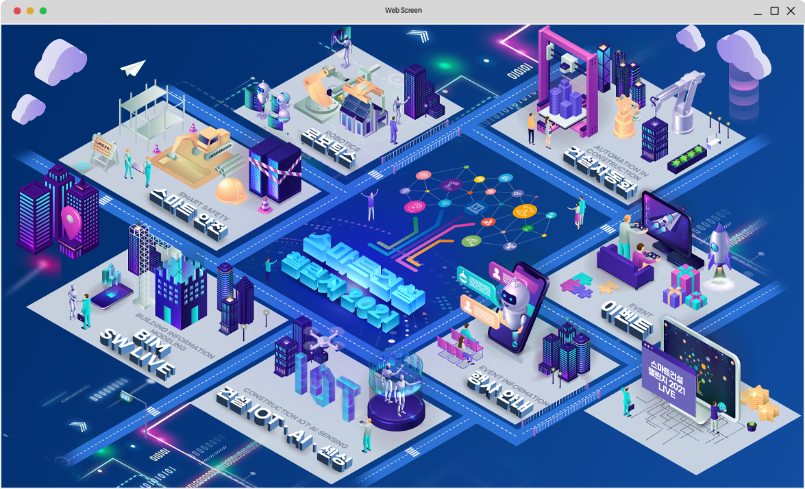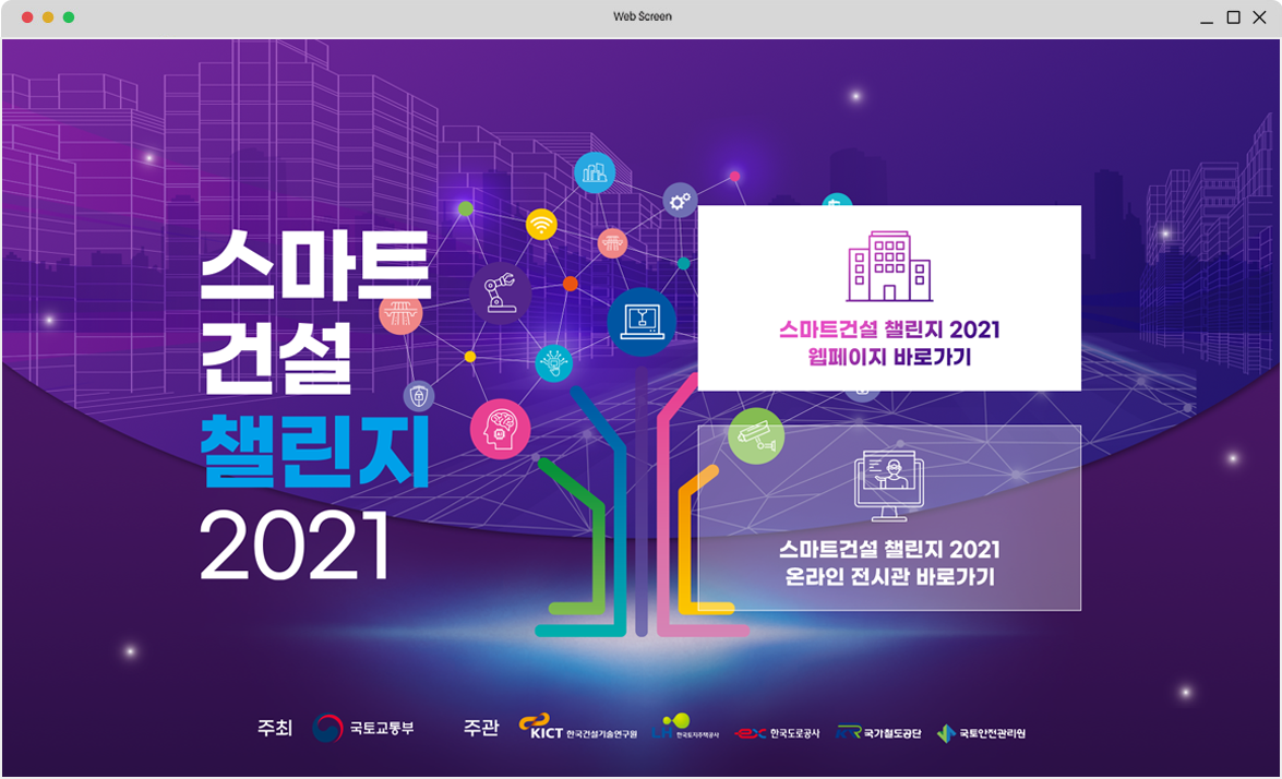 스마트건설 챌린지 2021의 행사 목적을 토대로 건설업체들의 스마트 혁신 기술 정보가 중점이 되는 웹사이트 구축을 목표로 전문적이면서도 역동적인 사이트를 구축하였습니다. 스마트 기술을 세분화하여 각 분야에 맞는 일러스트를 배치하여 자칫 어려울 수 있는 주제를 행사 참여자들이 직관적으로 다가갈 수 있도록 모듈화하였고 그에 맞는 역동적인 모션들을 추가해 흥미로운 화면을 구성하였습니다.