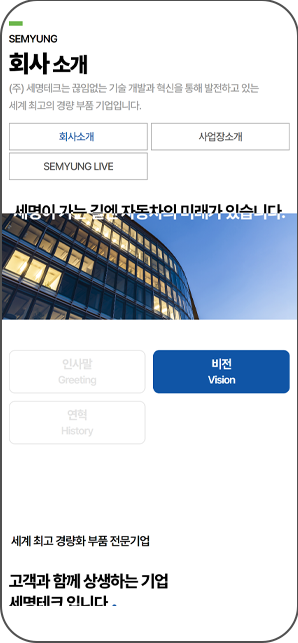세명테크는 경량화 부품전문 기업이며, 기업이 가지고 있는 기술력과 혁신성을 강조를 목표로 기업의 신뢰도를 높일 수