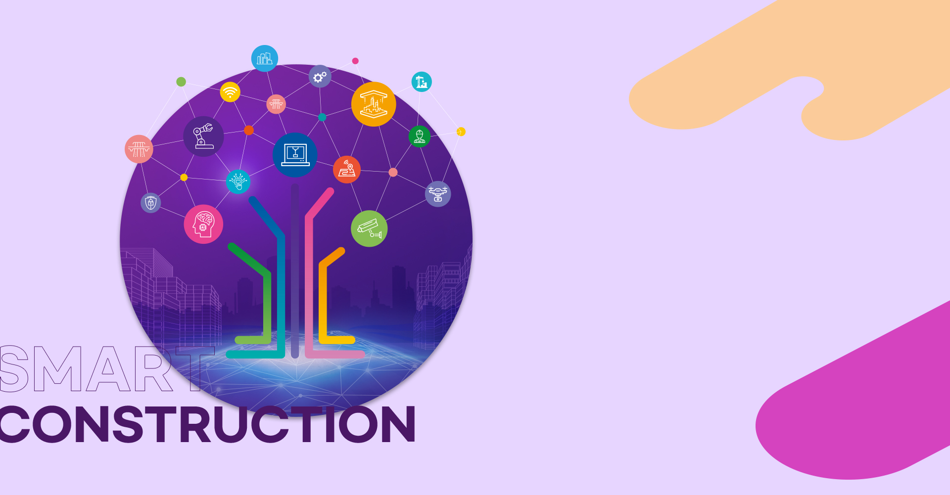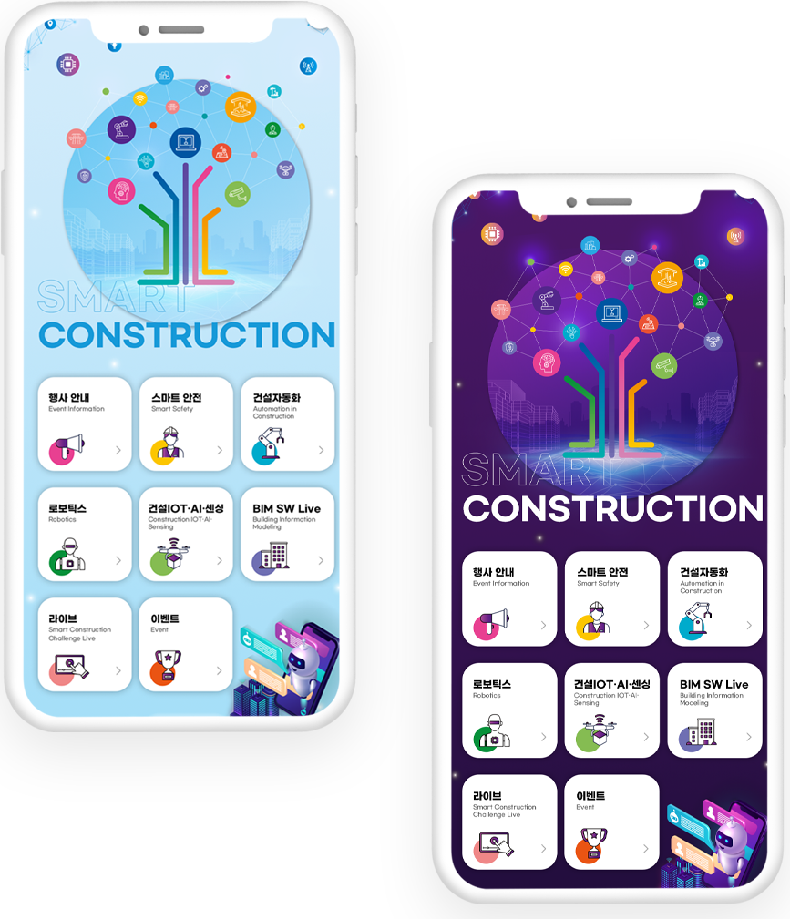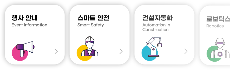 스마트건설 챌린지 2021의 행사 목적을 토대로 건설업체들의 스마트 혁신 기술 정보가 중점이 되는 웹사이트 구축을 목표로 전문적이면서도 역동적인 사이트를 구축하였습니다. 스마트 기술을 세분화하여 각 분야에 맞는 일러스트를 배치하여 자칫 어려울 수 있는 주제를 행사 참여자들이 직관적으로 다가갈 수 있도록 모듈화하였고 그에 맞는 역동적인 모션들을 추가해 흥미로운 화면을 구성하였습니다.
